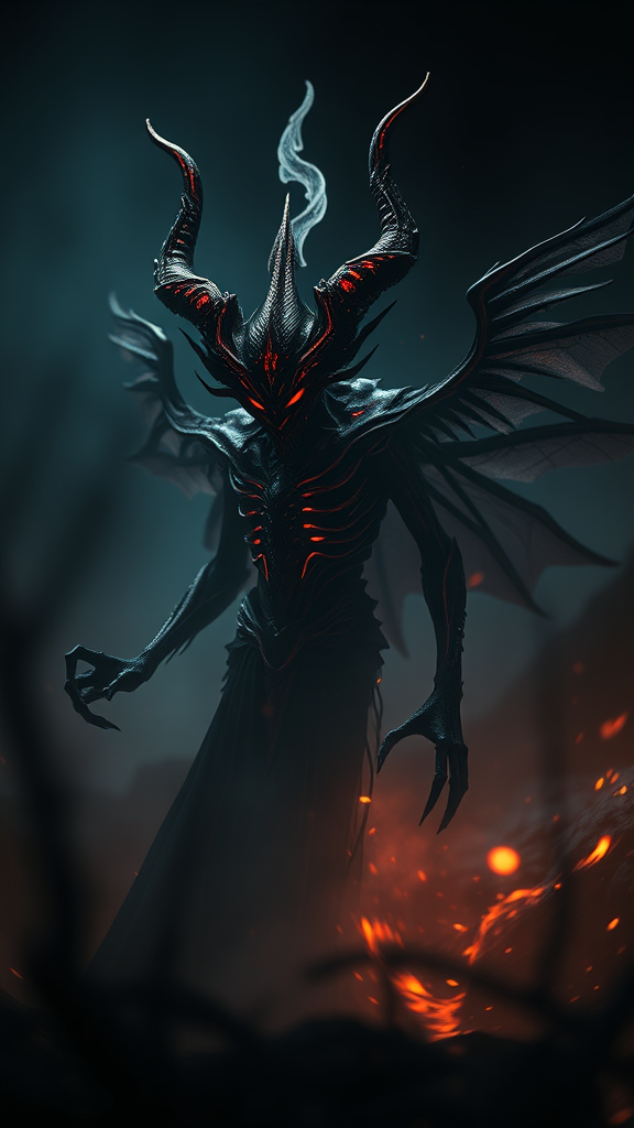A hauntingly mesmerizing spectral Jinn, Demon, or Ifrit set in a nightmarish landscape enveloped in eerie darkness, utilizing Unreal Engine 5 for its cinematic portrayal. The scene is captured with stunning editorial-like photography, employing a 70mm lens to achieve unparalleled depth of field and tilt-shift blur. Featuring a shutter speed of 1/1000 and an aperture of F/22, the composition boasts an exquisite balance of whites in a 32k super-resolution, utilizing Megapixel ProPhoto RGB for vibrant realism. Virtual reality heightens the epic feel, drawing inspiration from art greats like Artgerm and Alex Ross. Lighting contrasts from Halfrear, Backlight, to Natural, with striking accents from Incandescent and Optical Fiber sources, creating moody, cinematic studio environments. Volumetric effects enhance the Contre-Jour and Dark Lighting, complemented by Accent and Global Illumination techniques. Advanced rendering such as Screen Space Global Illumination, Ray Traced Global Illumination, and Red Rim Light techniques infuse the scene with a cool color grading of 45%. The optics involve scattering, glowing, and shimmering shadows, alongside Ray Tracing Reflections and Lumen Reflections for realistic depth. Screen space reflections, diffraction grading, and chromatic aberration add layers of complexity, with GB Shift and Scan Lines contributing to the vintage effect. State-of-the-art rendering encompasses Ray Tracing, Ray Tracing Ambient Occlusion, Anti-aliasing options like FKAA and TXAA, RTX, SSAO, alongside powerful Shaders including OpenGL and GLSL for intricate post-processing and tone mapping. In this CG masterpiece, VFX and SFX converge to create an insanely detailed, hypermaximalist experience, marked by stunning hyper-realism and super-detailed, dynamic poses within a precisely centered frame, evoking a captivating sense of otherworldly terror and awe.