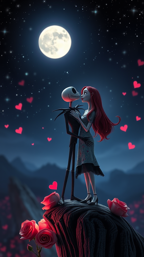 A hauntingly romantic scene unfolds under a star-studded night sky, with a luminous moon casting ethereal light over a whimsical landscape. Jack Skellington and Sally stand together at the edge of a gothic-inspired cliff, their skeletal and stitched hands intertwined amidst a backdrop of swirling roses and fluttering hearts. The essence of Valentine's Day blends with a touch of Halloween magic, creating a strange yet enchanting ambience. Tim Burton's distinctive stop-motion style captures every detail, from the expressive tilt of Jack's skeletal grin to the subtle blush on Sally's patchwork cheeks. Depth of field and cinematic composition add an otherworldly dimension to the scene, highlighting the tender and eerie affection between the two characters in their Nightmare Before Valentine's Day love fest.