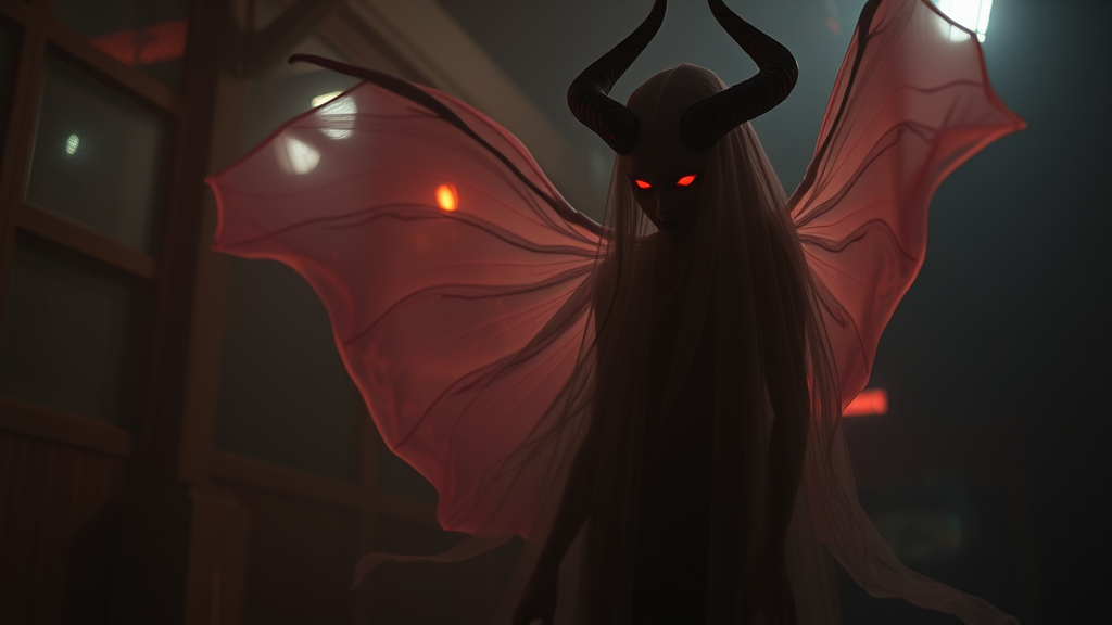 A hauntingly stunning Ghost Jinnat emerges, embodying elements of fear and allure. Picture an ethereal Jinn or Demon in an eerie, nocturnal setting, crafted with Unreal Engine 5; the scene evokes cinematic splendor. With editorial photography capturing the essence, a photoshoot employs a 70 mm lens, utilizing depth of field, tilt shift blur, 1/1000 shutter speed, and F/22 aperture. A masterful balance of 32k resolution with Super-Resolution and Megapixel clarity in ProPhoto RGB heightens the visual feast. VR elevates the experience, exuding an epic aura inspired by artgerm and alex ross. The lighting is a dance of contrasts: halfrear and backlit amidst natural, incandescent, optical fiber, and moody cinematic nuances. Studio setups fuse with soft and volumetric lighting, while contre-jour, dark, accent, global, screen space, and ray tracing bring luminosity, shadows, and ambiance to life. Red rim light accents intersect with a 45% cool color grading, optics, and scattering elements. The imagery glows with shimmering, rough textures via ray tracing reflections, lumen reflections, and screen space reflections, enhanced by diffraction grading, chromatic aberration, GB displacement, and scan lines. Advanced ray tracing, ambient occlusion, anti-aliasing methods (FKAA, TXAA, RTX), SSAO, shaders (OpenGL, GLSL), and post-processing finesse the aesthetic. Bringing cel shading and tone mapping into CGI, VFX, SFX, the result is insane detail, intricate hypermaximalism, elegant hyper realism, and super detail captured in a dynamic, centered pose -- with a photographic touch.
