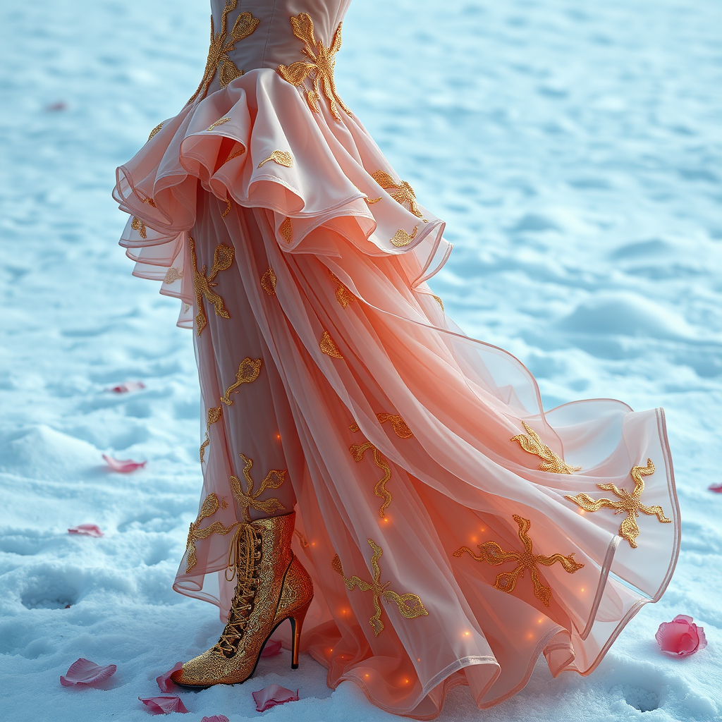 A haute couture dress inspired by the sea and roses, featuring elegant curvy designs with intricate gold gilded accents, paired with exquisite shoes adorned with lightning bolt laces. The ensemble is set against a hyper realistic, octane-rendered snowy backdrop, enhancing the ethereal and dramatic effect. The dress flows like ocean waves meeting delicate rose petals, offering a mesmerizing blend of natural beauty and opulence.