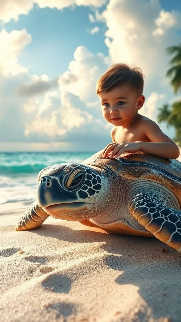 A Hawaiian sea turtle basks on a tropical beach beneath an ethereal, dreamy sky, its face perfectly photo-realistic, surrounded by a watercolor landscape reminiscent of Robert Wyland's artistry. The scene is highly detailed with dramatic cinematic lighting, captured in stunning 4k resolution, akin to the allure of a 50mm lens signature. A child gazes in wonder, their hands gently brushing the sand, embodying innocence and curiosity. The painting's atmosphere evokes both the purity of nature and the enchanting storytelling of an unknown artist, blending realism with imagination.
