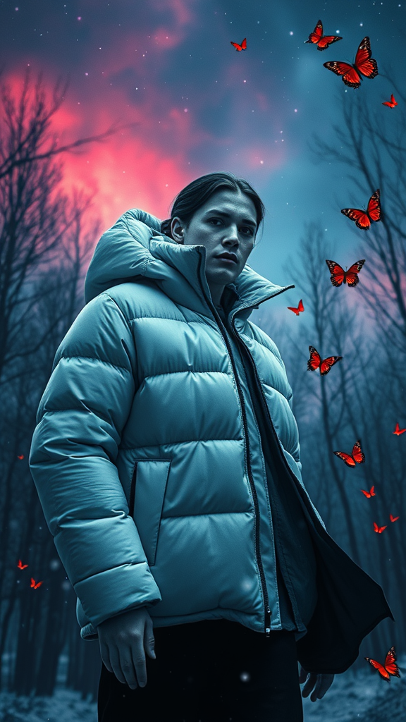 A hazy image of a snowy winter puffer jacket against the backdrop of a surreal night sky, where winds of change sweep through hues of deep red and blue. In a shadowy forest, lifelike butterflies exude a gentle luminescence, enhancing the minimalist elegance of the scene. The androgynous figures, draped in fluid black garments, exude an aura of cosmopolitan tranquility, their serene expressions contrasting the ethereal, abstract chaos. The palette remains cold and sophisticated, embodying a delicate balance between otherworldly beauty and earthly fashion.
