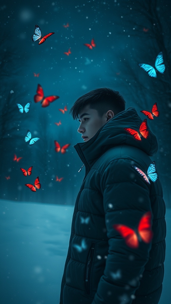 A hazy image of a snowy winter scene highlights an androgynous figure adorned in a sleek puffer jacket, framed by a surreal night sky alive with shifting patterns and winds in deep red and vibrant blue tones. Ethereal butterflies, casting a gentle luminescence, flit through a shadowy forest of minimalist beauty. The figures exhibit serene expressions, emanating cosmopolitan energy through their fluid movements. The scene is enveloped in a light black, cold palette with ethereal abstractions creating a dreamlike atmosphere, infusing chaos with a touch of order and artistry.