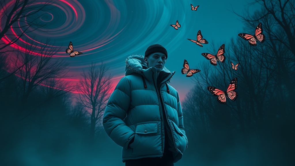 A hazy scene of winter fashion featuring a snowy puffer jacket under a surreal night sky, dominated by swirling shades of red and blue, showcasing the ever-changing winds. Realistic butterflies with a gentle luminescence flutter through a shadowy forest, capturing the essence of minimalist elegance. The androgynous figures, clad in subtle black tones, exude a cosmopolitan energy with serene expressions. Garments flow freely, embodying ethereal abstractions with a cool color palette, set against a backdrop that balances chaos and tranquility.