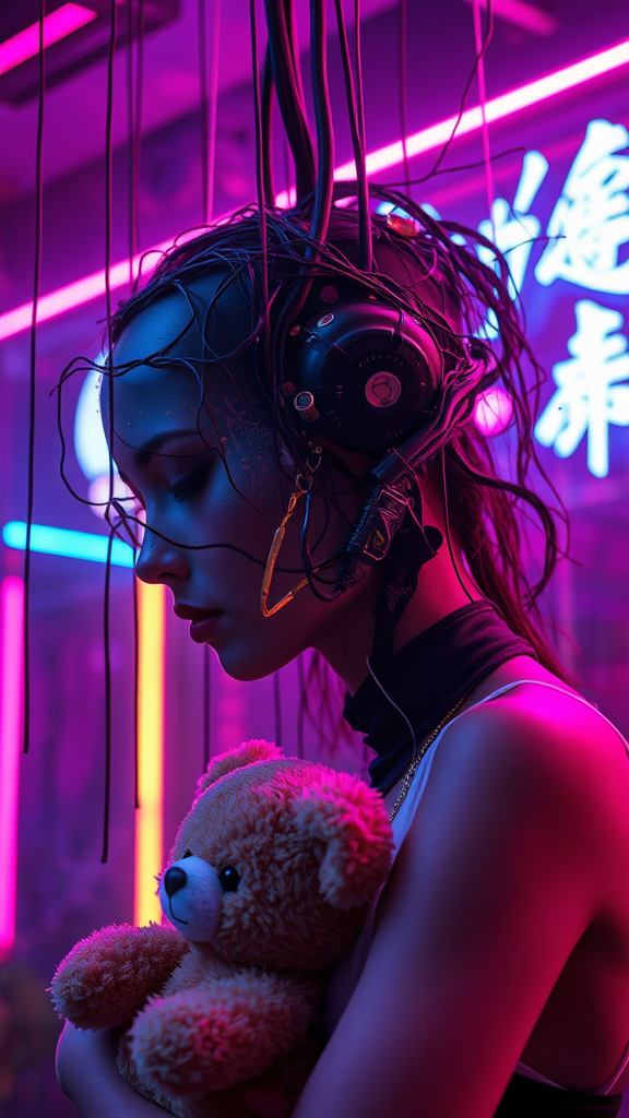 A head suspended by strings descending from the ceiling, enveloped in a palette of dark magenta and dark gold, adorned with organically inspired body art featuring detailed costume and fashion elements, punk art ethos, constructed from intertwined vines, fused with advanced technology, and infused with Chinese tradition. Alongside, a woman cradles a teddy bear amidst a backdrop of neon lights that illuminate her visage, characterized by modern jewelry and avant-garde futurism, bathed in hues of light navy and magenta, echoing solarpunk vibes, with a touch of Mars Ravelo’s influence. Her profile is accentuated by rim lighting, blending light amber and purple tones.