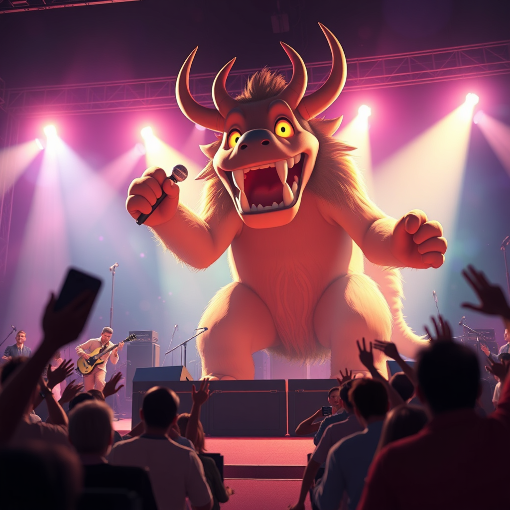 A heartwarming animation key shot of a towering band behemoth performing joyously on stage, capturing a medium shot with rich, vibrant colors reminiscent of Studio Ghibli, Pixar, and Disney animation styles. The scene is rendered in stunning 3D using Unreal Engine 5, featuring sharp, detailed textures and dynamic, dramatic lighting. Inspired by anime key art from Greg Rutkowski, the atmosphere is infused with a gentle bloom effect, highlighting the behemoth's expressive eyes and the lively energy of the crowd, creating a captivating moment that blends fantasy and reality in a uniquely magical way.