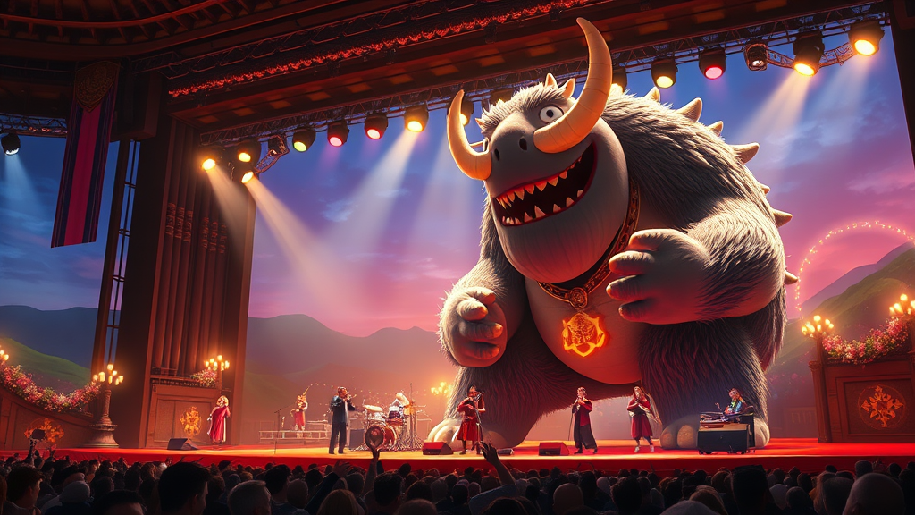 A heartwarming animation key shot of an enormous band behemoth joyfully performing on a grand stage, capturing the moment in a vibrant medium shot. The scene is reminiscent of Studio Ghibli, Pixar, and Disney animation styles, rendered in stunning 3D with the precision of Unreal Engine 5. Inspired by anime key art crafted by Greg Rutkowski, the scene is alive with a soft bloom effect and dramatic, enchanting lighting that highlights the behemoth's expressive features. The stage is adorned with whimsical decorations, and the behemoth's musical instruments resonate with intricate details, creating a magical atmosphere that invites the audience to share in the joyous performance. The backdrop features an enchanting, softly-lit landscape, seamlessly blending the fantasy elements of the scene.
