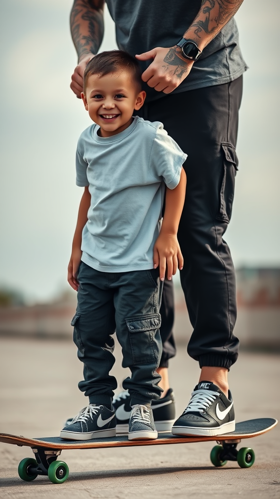 A heartwarming candid shot capturing a boy and his dad, both beaming with wide grins as they share a moment on a skateboard. The boy, exuding a playful yet cool vibe, wears a white loose-fit T-shirt paired with dark grey cargo joggers. His hands are firmly holding onto the strong, tattoo-adorned hands of his father, whose lower half is visible, clad in black loose-fit long sleeves. Their footwear tells a story of its own, with both sporting Nike SB skateboard shoes – the boy’s pair shiny and new, contrasting with his dad’s comfortably worn ones. This image beautifully balances the perfect face-to-body ratio, highlighting the shared joy and connection between generations, all in the gentle, natural light of a serene setting. Captured with a Sony α9 II using a Sony FE 100-400mm f/4.5-5.6 GM OSS lens, the photograph exhibits a high-contrast effect with UHD quality, subtly modified to enhance its raw and stylized aesthetic.
