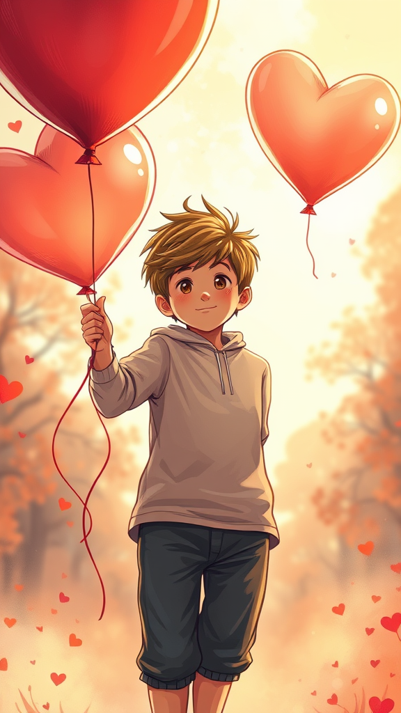 A heartwarming poster illustrates a young boy grasping a heart-shaped balloon, rendered in a Sketchfab-inspired style with Poodlepunk aesthetics. The scene is bathed in warm tones, reminiscent of #screenshotsaturday appeal, featuring romanticized figures and expressive comic panels. The composition embraces the allure of romantic academia, with HDR effects enhancing the depth. The boy strikes a dynamic pose, captured in 32k resolution with sharp focus, offering a vivid, high-definition illustration that remains both enchanting and captivating. Subtle creative tweaks include a gentle breeze tousling the boy's hair and delicate light reflections on the balloon, adding a touch of magic to the scene.