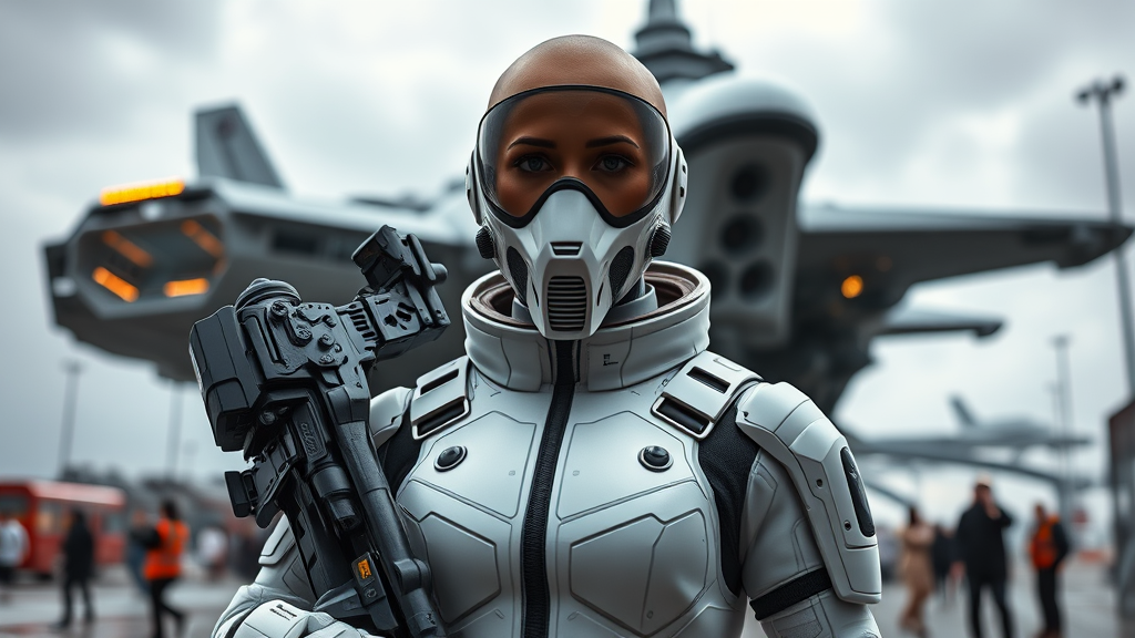 A heavily armed female figure stands confidently in a sleek white sci-fi spacesuit at a bustling spaceport, with an imposing sci-fi ship looming in the background under an overcast sky. She wears a high-tech mask with an integrated sci-fi visor and lens, complemented by a sophisticated sci-fi respirator. Her bald head highlights the smoothness of her design, while segments of plate armor provide isolated protection, intricately detailed with a futuristic aesthetic. Viewed from a low third-person perspective, the scene captures her formidable presence in striking detail. The visuals exude a sci-fi movie style, blending natural textures and lighting to create a photorealistic, cinematic rendering. The highest quality and detail are achieved through techniques like ray tracing and long exposure, resulting in an Ultra-HD composition with moody lighting and a subtle blur effect, enhancing the sense of motion and atmosphere.