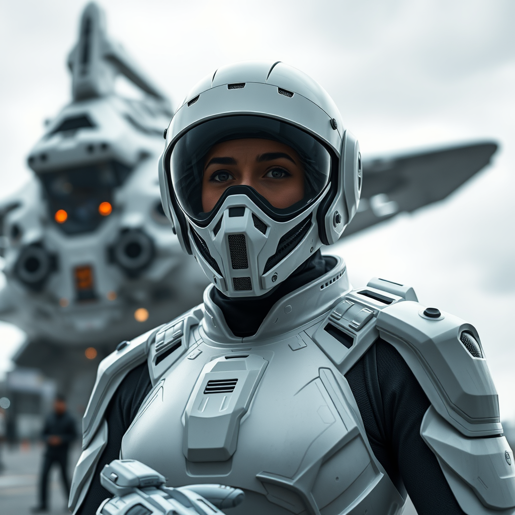 A heavily armed female figure stands confidently in a sleek white sci-fi spacesuit at a bustling spaceport. In the background looms a massive futuristic spacecraft under an overcast sky. Her face is partially covered by a sophisticated sci-fi mask adorned with intricate visors and advanced lenses. Her bald head is encased in a gleaming helmet, seamlessly integrated with plate armor and specialized isolated armor components. Viewed from a low third-person perspective, the scene captures the grandeur and detail of her ensemble in stunning clarity. The natural textures and lighting create a photorealistic effect reminiscent of a high-budget sci-fi film. The image features cinematic rendering with ray tracing, capturing the moody ambiance and fine details in ultra-high definition. The dynamic blur and long exposure convey a sense of movement and realism, enhancing the overall cinematic quality in 8K resolution, with an emphasis on natural and moody lighting effects.