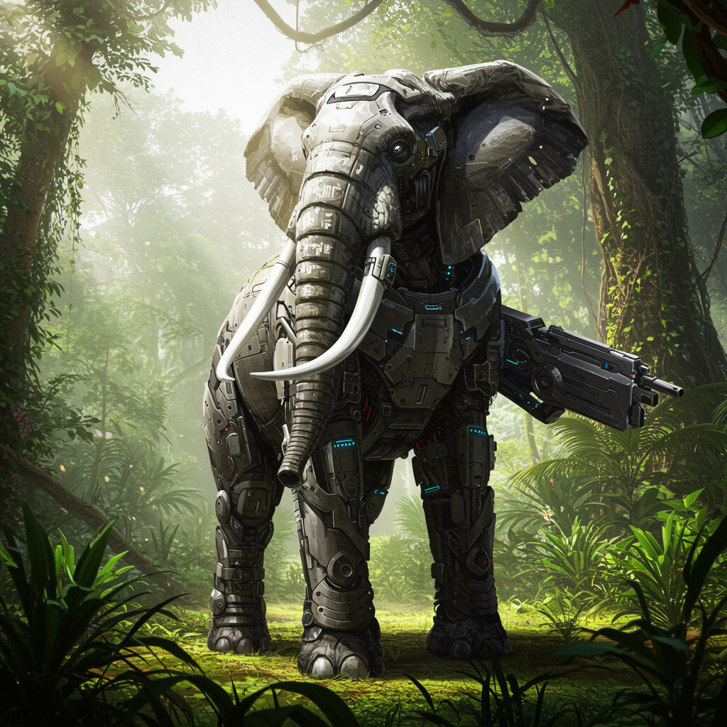 A heavily armored cyberpunk elephant stands majestically, its battle gear glinting under the dappled sunlight filtering through the dense canopy of a vibrant tropical forest. The intricate patterns of its armor catch the light in a chiaroscuro sgraffito style, contrasting sharp shadows with bright highlights, accentuating the elephant's powerful form and futuristic enhancements against the lush, vivid greenery surrounding it. The harmonious fusion of nature and technology creates a breathtaking and dynamic scene.
