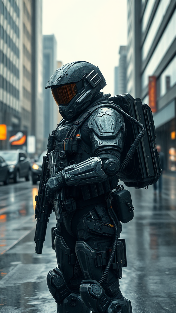 A heavily armored futuristic soldier equipped with cutting-edge weaponry and gadgets stands on a rainy urban street, their reflective gear glistening under the overcast sky. The intricate design of their suit features seamless blends of technology and artistry, with every detail contributing to a photorealistic and hyper-realistic portrayal. Dramatic lighting highlights the contours of their armor, casting dynamic shadows that add to the cinematic quality of the scene. The environment is rendered in 8k resolution, leveraging the capabilities of the unreal engine, capturing every nuance of the soldier's movement and the city's atmosphere, maintaining the core essence of advanced design and intense realism in a vertical 9:16 aspect ratio.