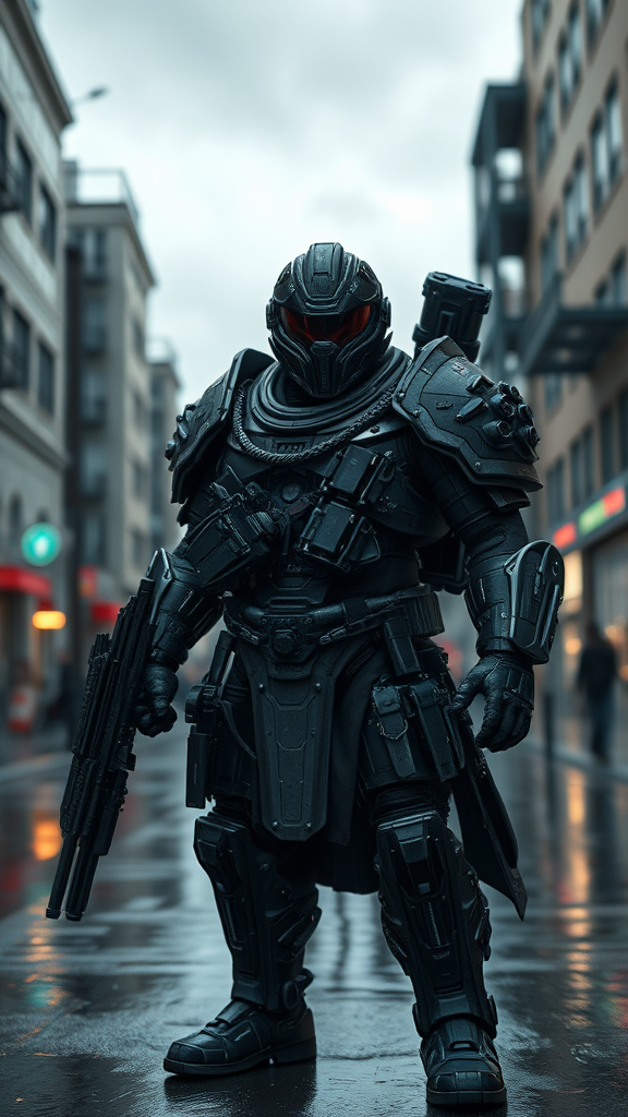 A heavily armored futuristic warrior equipped with cutting-edge weaponry and high-tech gadgets, standing on a rain-soaked urban street, surrounded by an overcast sky. The scene features detailed reflection mapping, showcasing the intricate design and realism of the battle armor. Presented with dramatic and cinematic lighting, the artwork is rendered with hyperrealistic attention to detail in 8k resolution using advanced graphics techniques, creating a photorealistic effect akin to Unreal Engine styling.