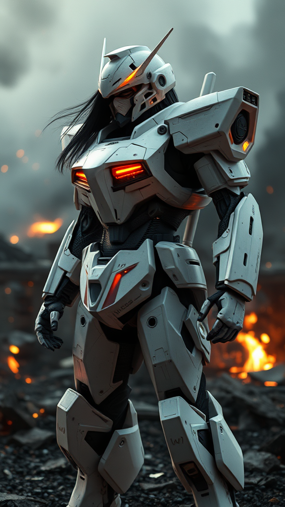 A heavily damaged mecha pilot, his entire body hidden beneath a gleaming white Gundam-style exosuit, the only hint of his humanity his long black hair visible beneath the full cover facial armor. A streak of fire dances along the edge of his armor as he stands amidst the smoldering ruins of a desolate battlefield, embers crackling in the air around him. The overly dramatic lighting and HDR capabilities of the Unreal Engine 5 amplify the intense atmosphere, with light bloom and depth of field adding to the cinematic feel of the scene. A missing arm and hand give the pilot a sense of vulnerability, contrasting with the might of his armor. The concept art style is undeniable, with RTX technology painterly rendering the photorealistic image, all captured in high-definition, lovely, engraved, you, into every perfectly rendered, empower, essence hampered, embattle illuminated, acute.