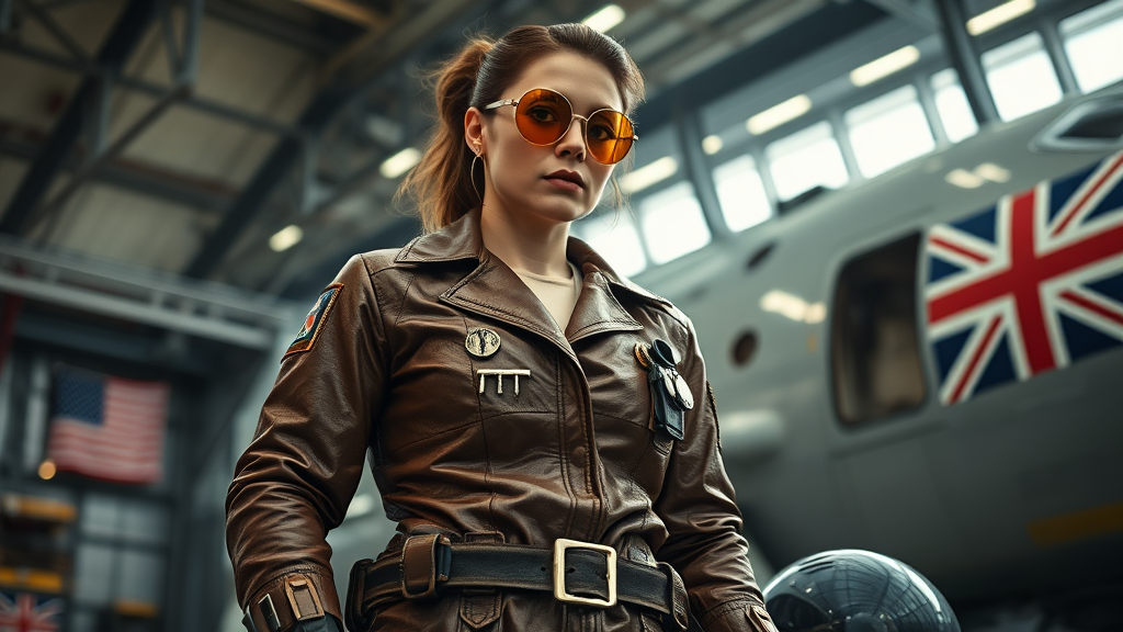 A heroic female mechanic stands confidently in a spacecraft hangar, wearing an intricately detailed formal leather uniform in cool oak and pewter tones, accented with sci-fi and cyberpunk elements. Her uniform is adorned with medals and features a utility belt equipped with various tools. The scene is set with dramatic cinematic lighting, capturing her in a low angle shot that emphasizes her dynamic action posture, bringing her full scale to life. She sports golden pilot sunglasses and her face is depicted with the highest attention to detail, showcasing a masterpiece of realistic fabric details and precise folds in her uniform. In the background, which is subtly present and low in contrast to keep the focus on her, a flag with stars and stripes and the union jack can be made out, hinting at an international setting. A helmet rests nearby as she stands ready for action, embodying the strength and determination of a master mechanic in a futuristic world. The depiction avoids elements that detract from her professionalism, maintaining respect and focus on her skill and presence.