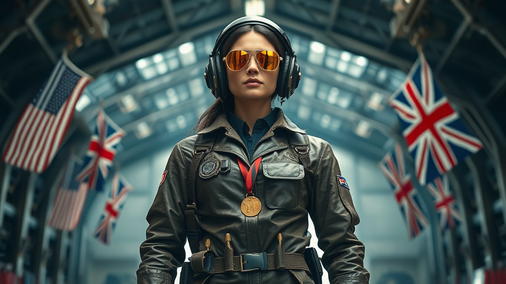 A heroic female mechanic stands confidently in a spacecraft hangar, wearing an intricate and highly detailed formal Oak Cool Pewter leather uniform that blends sci-fi and cyberpunk elements. The uniform is adorned with medals and a utility belt loaded with essential tools. Golden pilot sunglasses accentuate her determined expression, captured in highest facial detail. The dynamic low angle shot emphasizes her action-ready posture, with dramatic cinematic lighting highlighting the realistic fabric details and folds. Her uniform is complete with a helmet and hard surface accessories. In the background, flags such as the Stars and Stripes and the Union Jack add a touch of international flair against a simplistic backdrop with low contrast to maintain focus on her. She exudes mastery and skill, reminiscent of a cinematic masterpiece rendered in 8k resolution.