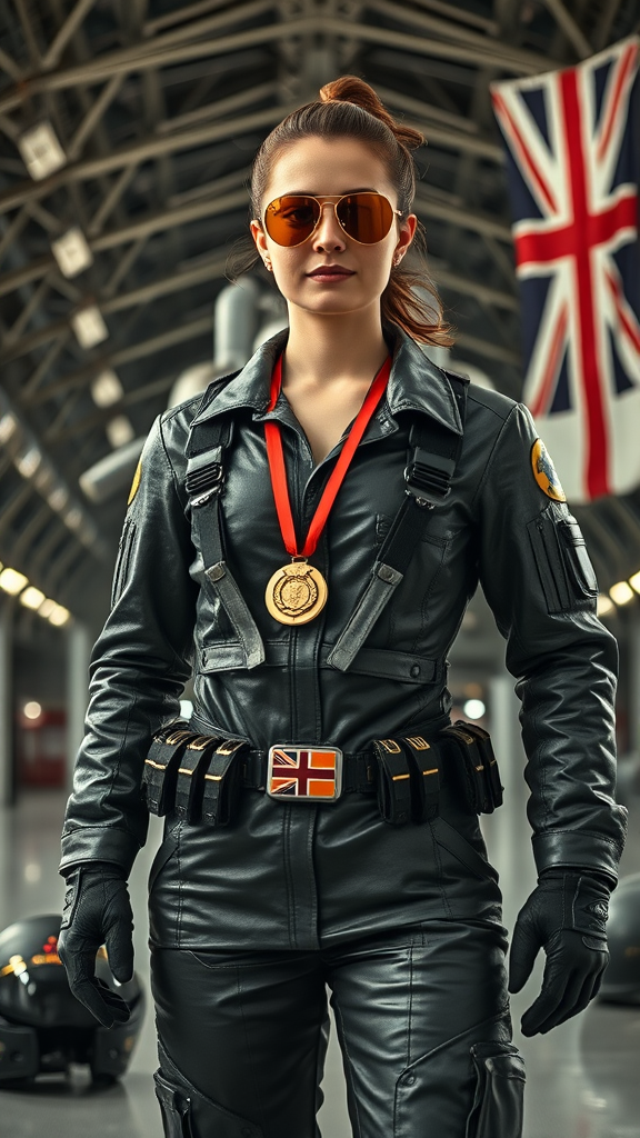 A heroic female mechanic stands confidently in a spacious spacecraft hangar, wearing an intricately detailed formal Oak-Cool Pewter leather uniform. The sci-fi, cyberpunk aesthetic is highlighted by her golden pilot sunglasses and a utility belt adorned with tools. Medals gleam on her chest, underscoring her achievements. The scene is captured in dramatic cinematic lighting, with a low angle shot that emphasizes her dynamic action posture. Her expression is focused and determined, embodying the essence of a skilled pilot and mechanic. The realistic fabric details and folds of her uniform showcase impeccable craftsmanship. In the background, a simple monochrome setting with low contrast avoids distraction, allowing the proud display of the stars and stripes, and the Union Jack flags. A helmet and other hard-surface tools lie within reach. The visual masterpiece, rendered in 8k resolution, ensures high facial detail and adds to the realism of this futuristic tableau.