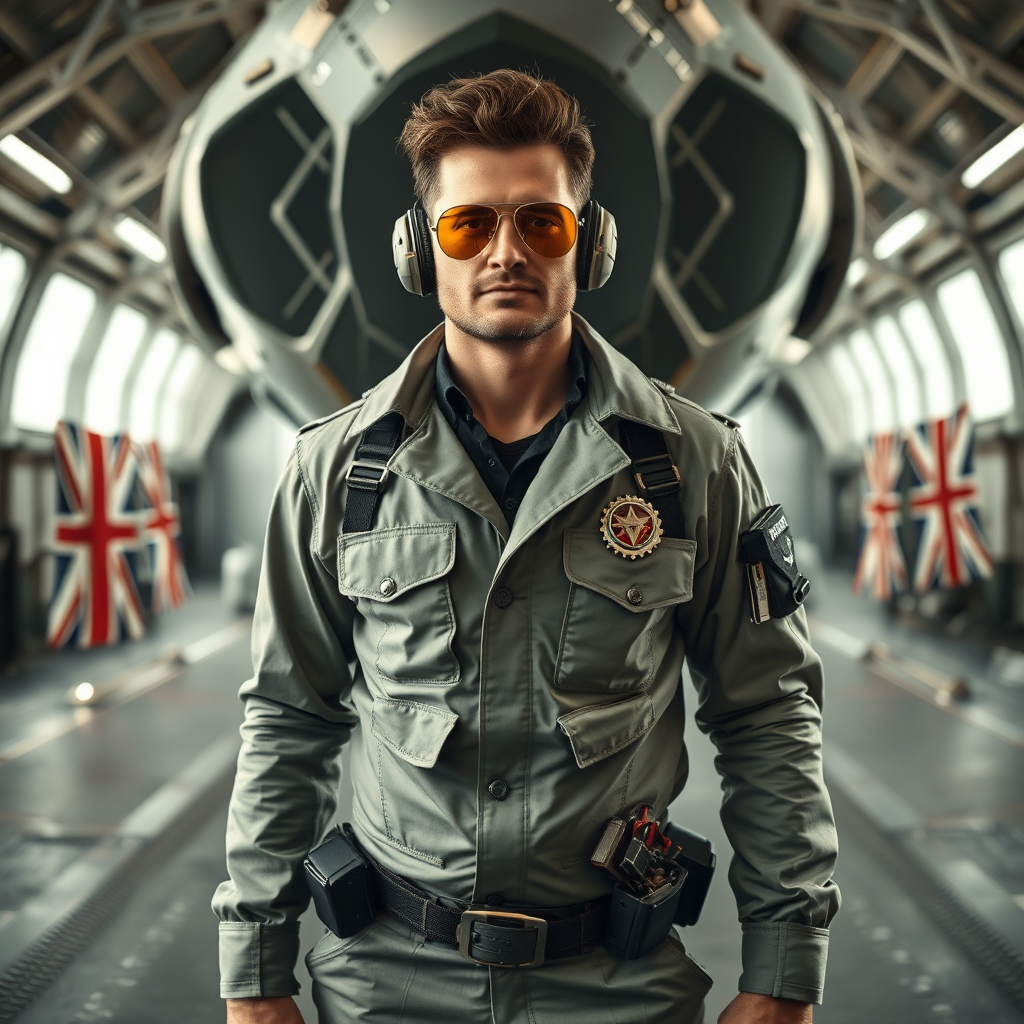 A heroic male mechanic stands in a spacecraft hangar, showcasing an intricate, highly detailed formal Olive Fresh Nickel silver cloth uniform that blends sci-fi and futuristic steampunk elements. Adorned with medals and a utility belt packed with tools, his attire features realistic fabric details and folds. Dramatic cinematic lighting and a low angle shot emphasize his dynamic action posture, complemented by golden pilot sunglasses that add a touch of flair. The scene captures his highest facial details, exuding the essence of a masterpiece in 8k resolution. The background remains simple and monochrome, featuring low contrast with minimal noise, while a hard surface floor and subtle flags of stars and stripes and the Union Jack softly drape in the distance. The mechanic's expression is confident and focused, capturing the spirit of a skilled artisan in an inspiring sci-fi setting.