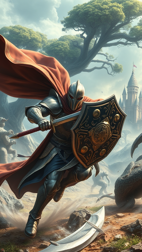 A heroic paladin clad in intricately detailed armor, with shimmering silver and gold accents, wields a gleaming longsword and a majestic shield embossed with celestial symbols. The paladin charges forward in a dynamic action scene, amidst a swirling battleground, bathed in ethereal light. The landscape is a fantastical realm, with towering ancient trees and a distant castle shrouded in mist. The paladin's cape billows dramatically in the wind as they confront a formidable foe, eyes blazing with unwavering determination.