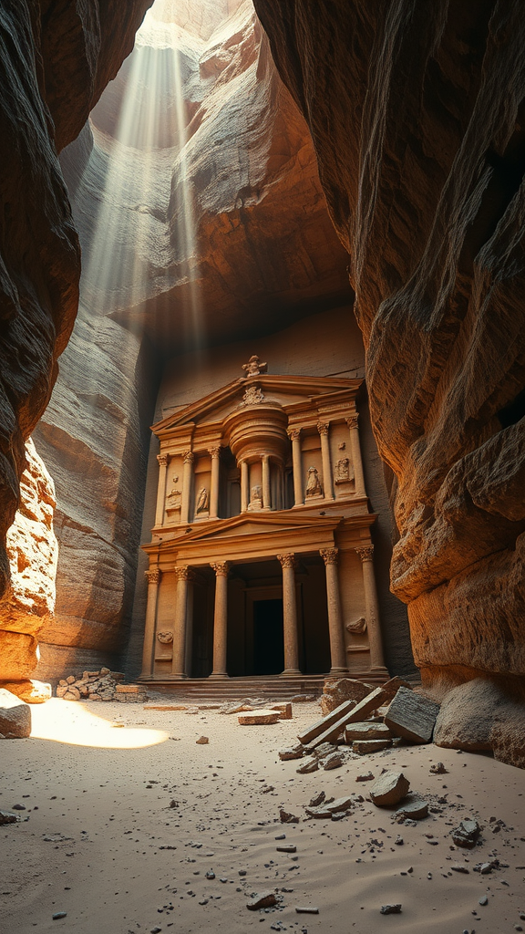A hidden, ancient Sumerian Temple nestled within a canyon wall, its ruins partially submerged in sand and debris scattered near the entrance. The surrounding landscape is a vast desert under a dark canyon that allows beams of sunlight to pierce through, creating dramatic, volumetric lighting reminiscent of Petra. The scene is captured in a cinematic style showcasing the temple's intricate carvings and the contrasting play of shadow and light. Despite the weathered appearance, the temple's grandeur persists, drawing the viewer into its mysterious, mystical ambiance. The ultra-high-definition and high dynamic range visuals enhance the intricate details and atmospheric depth of the scene. There are no visual anomalies such as deformed features, extra limbs, or low-quality artifacts, ensuring a polished, immersive experience.