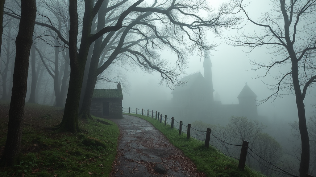 A hidden forest path leads to an ancient, forgotten village cloaked in mist, where time seems to stand still and whispers of the past linger in the air.