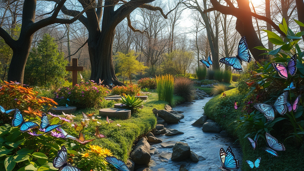 "A hidden garden teeming with iridescent butterflies, where time seems to pause, and the air is filled with the whispering of ancient trees and the gentle babbling of a crystalline stream."