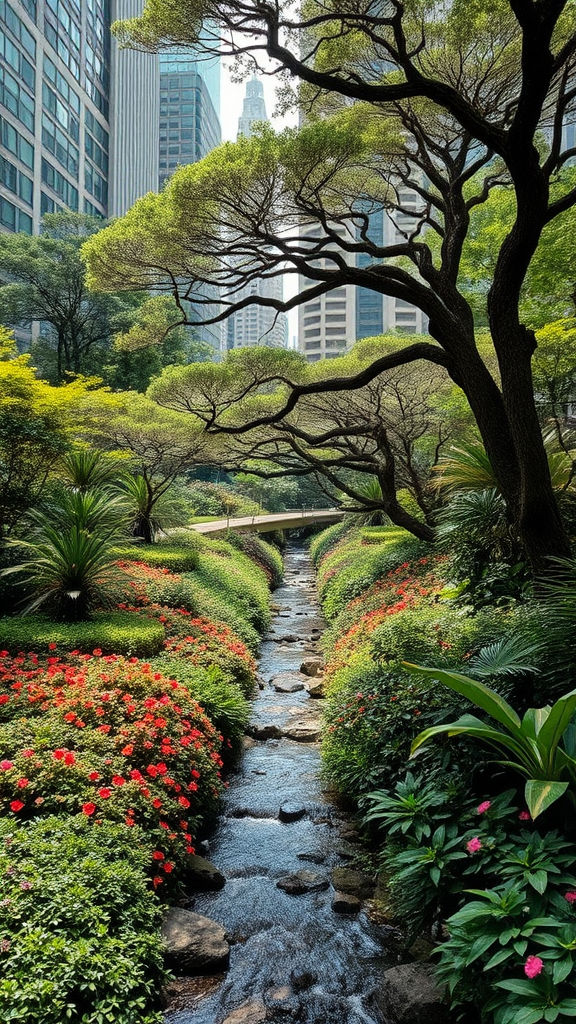 A hidden garden thrives in the heart of a bustling city, a sanctuary where time slows and nature reclaims the urban landscape. Towering skyscrapers form a protective barrier around this lush oasis, where vibrant flowers and ancient trees shelter a world teeming with life. In this tranquil haven, a gentle stream winds its way through the undergrowth, whispering secrets to those who wander along its banks. Here, away from the noise of modern life, the air is filled with the symphony of birds and the rustle of leaves, inviting visitors to find solace and inspiration in nature's embrace.