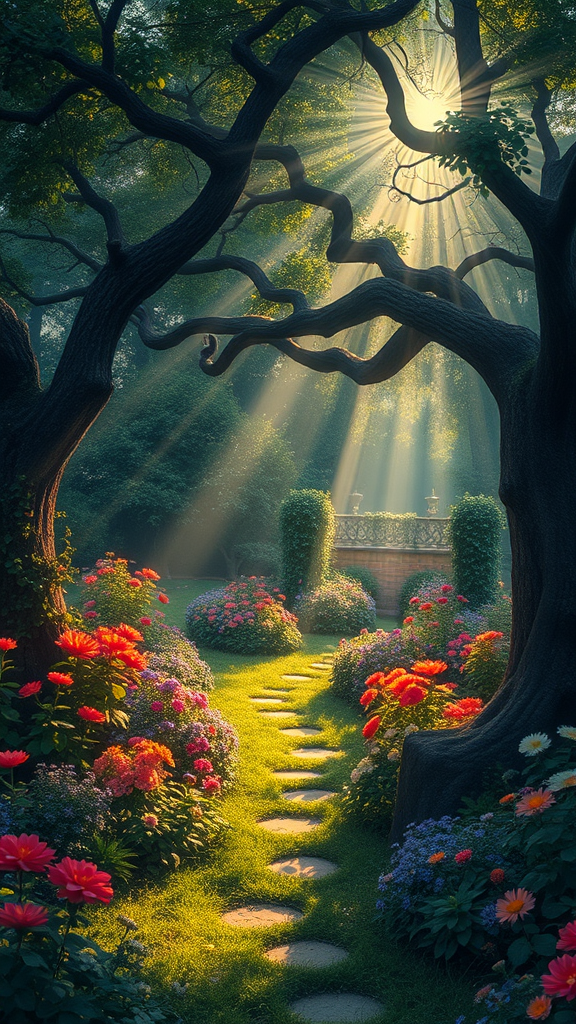 A hidden garden where time seems to pause, filled with vibrant, ever-blooming flowers that glow softly under a canopy of ancient trees, creating a sanctuary for ethereal creatures that dance in the beams of moonlight filtering through the leaves.