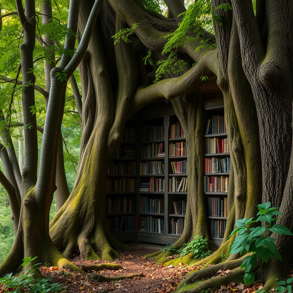 A hidden library nestled within an ancient forest, where books whisper secrets of the past to those who dare to listen.