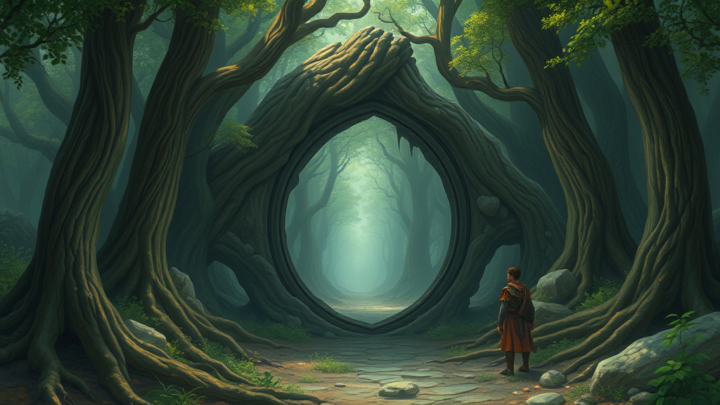 "A hidden portal in the ancient forest reveals a world where time flows differently, and mysterious creatures roam, guiding lost souls to uncover secrets of the past and future."