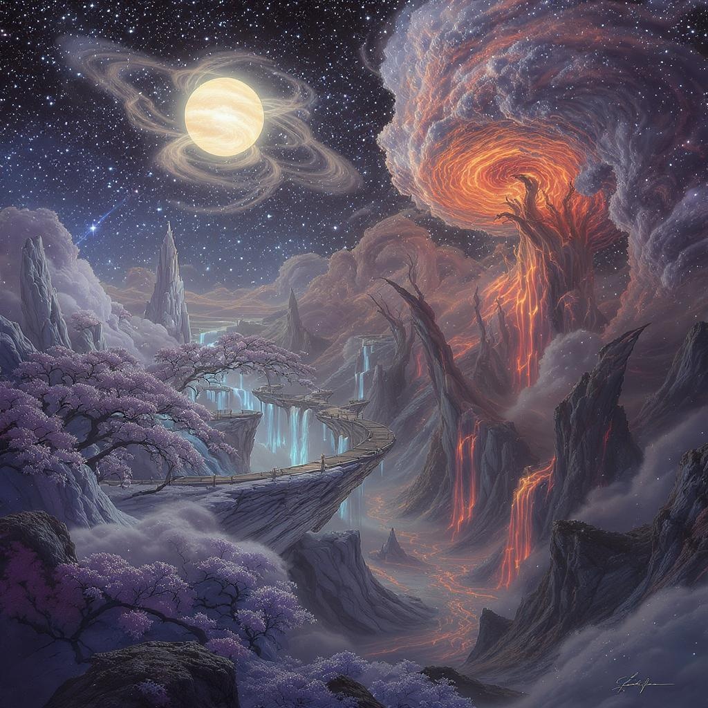 a hidden realm within an expansive universe::5 intricate fantasy landscapes, captured from a celestial vantage point, rich in detail::3 ethereal heavens and fiery underworlds::2