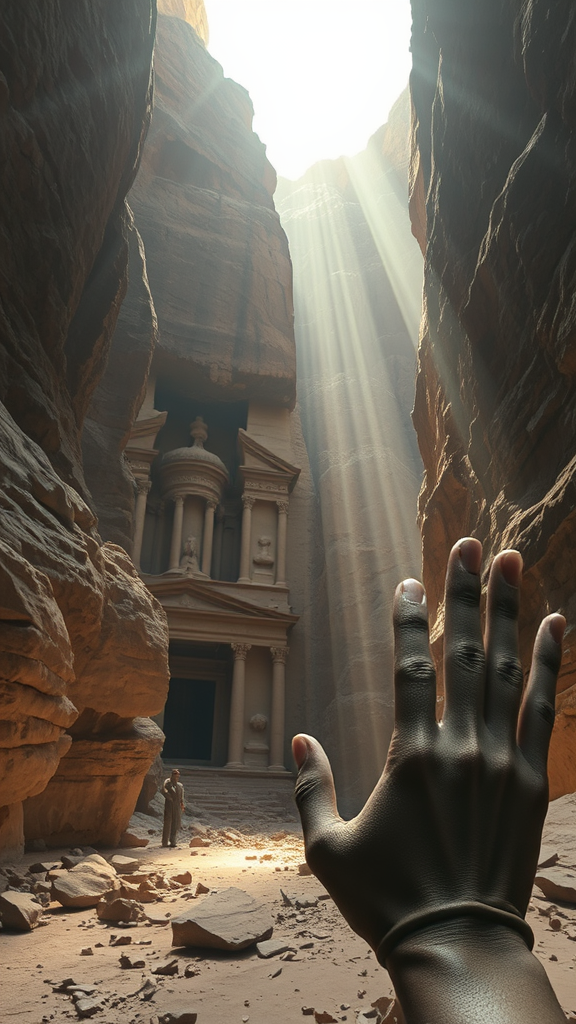 A hidden Sumerian temple lies nestled within the rugged walls of a canyon, its ancient stone structure weathered and partially in ruins. Debris from ages past is scattered near the entrance, hinting at the secrets buried within. The scene is set in a vast desert, where a dark canyon opens to the sky, allowing ethereal rays of sunlight to pierce through the arid atmosphere. The style echoes the grandeur of Petra, showcasing intricate carvings and architectural marvels. The cinematic ambiance is enhanced by volumetric lighting, creating a dramatic interplay between shadow and light. The image is rendered in stunning 16k resolution, embodying the richness of UHD and the vivid detail of HDR. Despite the surreal beauty, subtle imperfections add an intriguing character to the scene, hinting at optical illusions with deformed irises, cross-eyed figures, and strangely cloned faces. The hands seem to hold mysterious stories of their own, with extra fingers and mutated forms. This awe-inspiring landscape invites the viewer to explore its untold narratives, set in an ancient world lost in time.