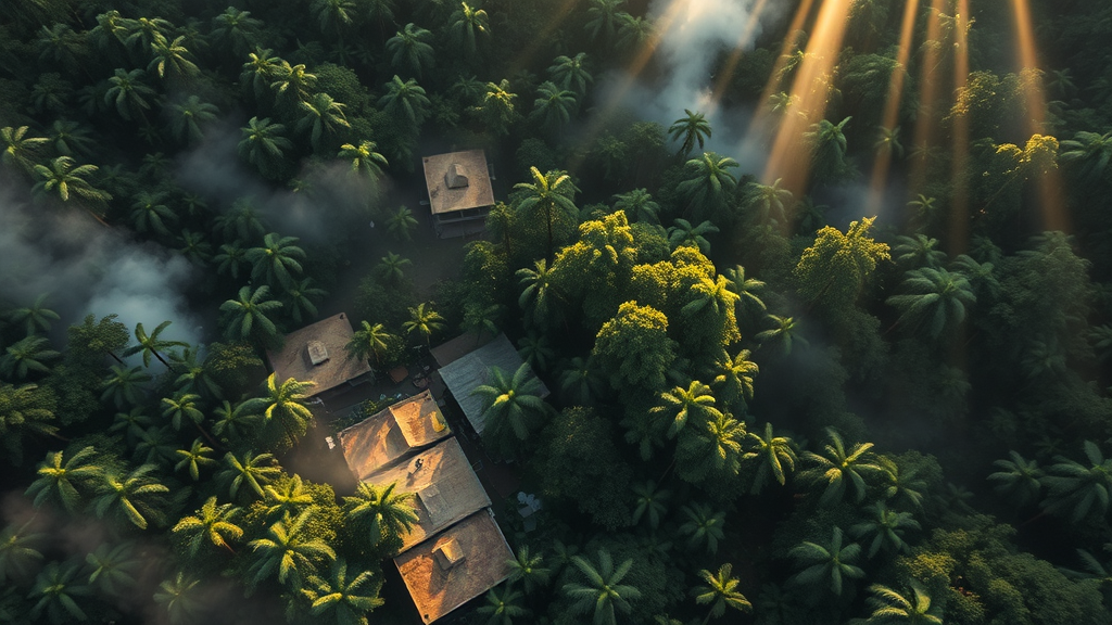 A high-altitude drone shot capturing an adversary encampment nestled within a dense, emerald-green rainforest; mist subtly clings to the canopy while sunrays pierce through the foliage, casting intricate shadows on the hidden structures below. Brightly colored birds occasionally flit across the scene, while camouflaged rooftops barely peek through the thick treetops, and winding trails of smoke rise into the air, hinting at activity within the covert base.