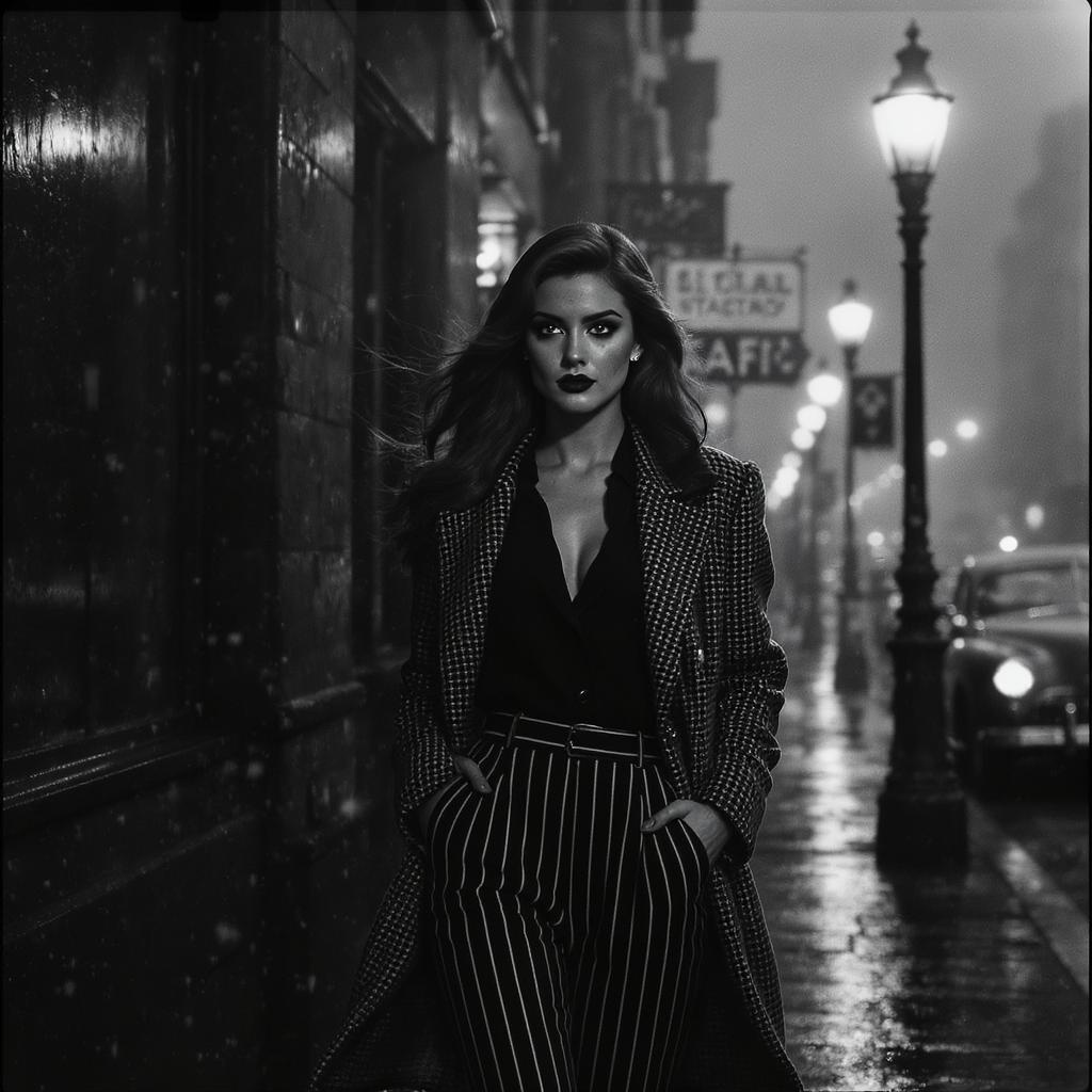 A high-contrast black and white film captures a full body movie clip of the most captivating detective woman in a classic 1940s setting. Her long, shiny hair frames her freckled face, accentuating her dark, reflective eyes and impeccable makeup. Walking purposefully down a misty, fog-laden street, she exudes an aura of both elegance and mystery, enveloped by the glow of vintage street lights. She is dressed in pinstripe trousers and a tweed coat, every detail enhanced by dramatic, rim lighting that casts artistic shadows, adding depth to the scene. The street, a striking blend of nostalgic ambiance and modern elements like sleek cars in the backdrop, highlights the timelessness of her presence. The black and white photography creates a shallow focus with rich textures and a depth of field that draws attention to the fine mist and dust particles in the air.