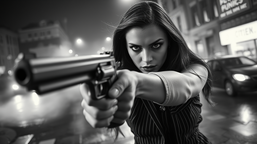 A high contrast black and white film captures a gripping gunfight action scene, set in the style of a 1940s noir detective story. A striking woman with a beautiful face and long shiny hair, sprinkled with freckles, aims a Colt revolver with precision. Her intense, dark reflective eyes are framed by expertly applied makeup. The scene is steeped in atmosphere, with mist swirling and fog clinging to the wet pavement, illuminated by detailed, dramatic rim lighting. She wears pinstripe trousers, adding to the period authenticity. Streetlights cast long shadows, enhancing the noir feel. A shallow depth of field centers attention on her determined expression, the background blurred to focus on the tension of the moment. The setting merges vintage style with subtle modern elements, seen in the flash of an occasional modern vehicle and the buzz of a city street.
