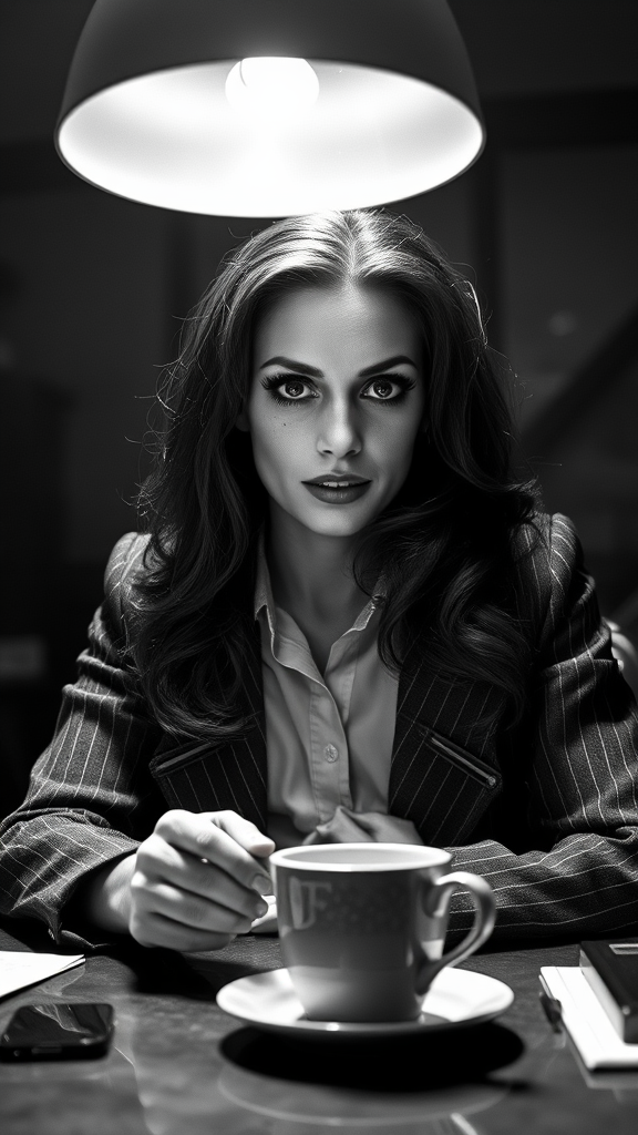 A high-contrast black and white film captures the world's most beautiful detective in a classic 1940s noir setting. She sits confidently at a desk, her long, shiny hair framing a detailed, symmetrical face adorned with subtle makeup and dusted freckles. Her dark, reflective eyes are the focal point of this dramatic portrait. The detective is dressed in a crisp outfit featuring pinstripe trousers and sits with a steaming cup of hot coffee before her. Intricate interplay of dramatic rim lighting highlights the scene, casting intriguing shadows that dance with the dust particles in the air. A ceiling lamp above casts a focused glow, enhancing the overall mystery. Despite the shallow depth of field, the imagery remains sharp with a timeless depth of character.