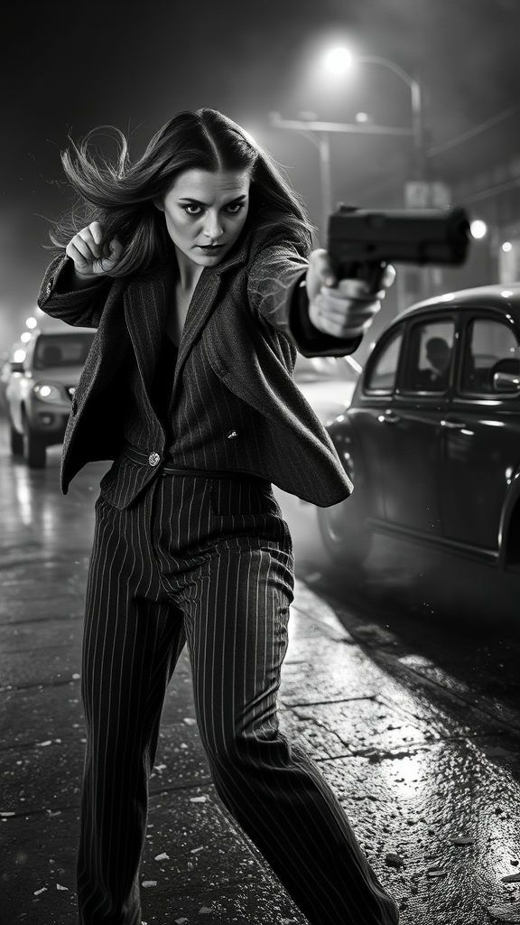 A high-contrast black and white film scene captures a gunfight action sequence featuring a 1940s noir detective woman with a beautiful face and captivating dark eyes. She deftly dodges bullets in slow motion, her long, shiny hair and freckles subtly highlighted. As gunshots ring out, glass shatters around her, adding to the dramatic flair. The scene is set on misty, fog-laden wet pavement, where dust particles dance in the air, illuminated by detailed, dramatic rim lighting. She wears pinstripe trousers with a tailored fit that accentuates her slender form, embracing the classic detective look. The textured tweed of her outfit contrasts with the modern cars in the backdrop, merging eras seamlessly. Street lights cast shadows on the scene, enhancing the depth and shallow focus of the cinematic imagery. Amidst the chaos, she expertly maneuvers with grace, her makeup accentuating her sharp features, capturing the essence of film noir with an evocative blend of style and suspense.