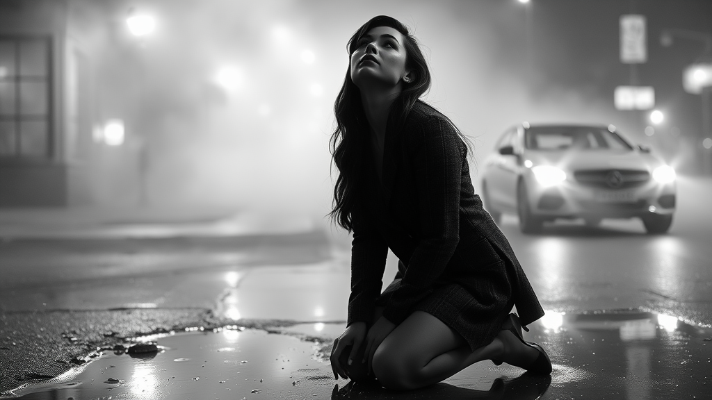 A high-contrast black and white movie clip from the 1940s captures the essence of noir as the most beautiful detective woman in the world kneels on a mist-covered street. Her long, shiny hair cascades down her back, and her dark, reflective eyes glance upwards with intensity, framed by perfectly applied makeup. She is slender, her silhouette accentuated by dramatic, detailed lighting and the subtle glow of streetlights. The fog and dust particles create an ethereal atmosphere around her. Wearing a classic tweed outfit that pays homage to vintage fashion, she embodies the elegance and mystery of the era. The scene captures a shallow depth of field, focusing intently on her poised figure amidst the surrounding puddles, which mirror the fragmented light. A modern car is seen in the background, juxtaposing the setting. The shot emphasizes her timeless beauty and captivating presence, reminiscent of classic black and white photography with a keen focus on cinematic artistry.
