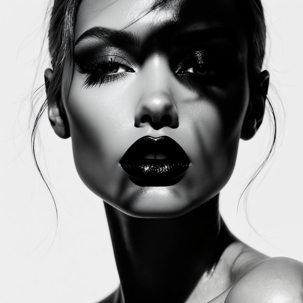 A high-contrast black and white photograph featuring the captivating face of an alluring woman, with emphasis on her elegant lips highlighted by deep shadows. The image exudes a modern, minimalist aesthetic, perfect for a fashion magazine cover or high-end advertising. It combines elements of mystery and style while maintaining a sense of simplicity and power. The composition is artistic and iconic, capturing the woman's beauty in a striking, stylized manner that is both captivating and timeless.