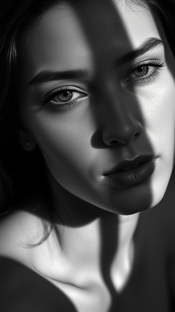A high-definition black and white photograph features a woman exuding minimalist beauty. Her serene face, framed by the soft play of shadows, is highlighted with light bronze and bronze tones that add warmth to the monochrome palette. The composition emphasizes sharp edges and high contrast shading, echoing a karencore style that is both contemporary and timeless. The realism in her expression and the meticulous detail in her features captivate the viewer, creating a striking image that balances simplicity with depth.