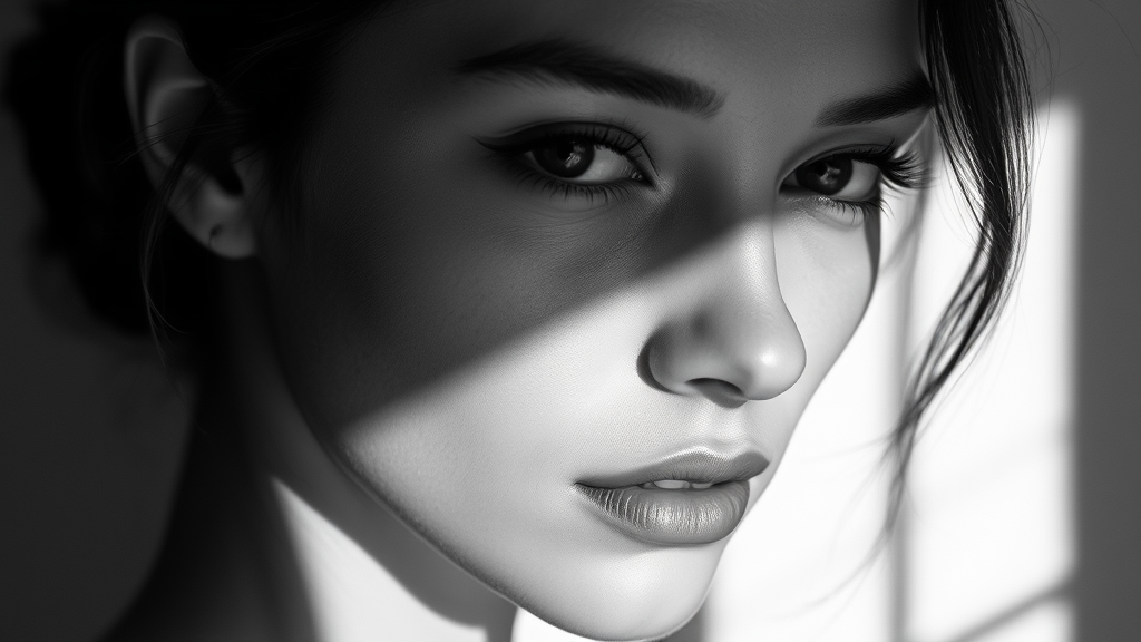 A high-definition black and white photograph of a woman exuding minimalist beauty, with soft light bronze and deep bronze tones subtly blending across her serene face. Her features boast sharp edges, capturing the essence of karencore with a nuanced realism. The interplay of light and shadow creates compelling contrast shading, enhancing the photo’s depth. The composition maintains artistic integrity with a balanced 3:5 aspect ratio, subtly stylized while retaining a raw, authentic presence.
