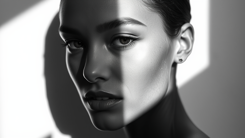 A high-definition black and white portrait captures a woman with sharp, serene features, her face partly illuminated, partly in shadow. The minimalist beauty of the image highlights her light bronze skin with subtle hints of bronze undertones. The stark contrast and shading reflect a realistic portrayal, evoking a sense of calm elegance. Her expression is tranquil and composed, embodying a karencore aesthetic that emphasizes simplicity and understated sophistication, with a focus on crisp details and refined edges.