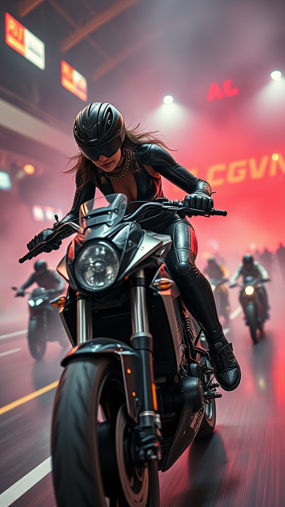 A high-definition cinematic ultra-wide shot captures cyber-enhanced biker Zzz leaning aggressively over her streamlined, high-tech battle bike. She's clad in a sleek black latex jumpsuit integrated with intricate implants. The scene unfolds in a smoke-filled arena where kinetic races rage, the atmosphere charged with tension and energy. A multitude of cyber bikers pursue her in a relentless chase, their silhouettes blurring with speed. The setting is bathed in dramatic, cyberpunk-inspired lighting that highlights the hyper-realistic, meticulously detailed environment. The cinematic style evokes early 2000s sci-fi aesthetics, reminiscent of iconic filmmaking techniques. This extreme wide view accentuates depth of field and lively motion without any distractions or imperfections, capturing the essence of hyper-futuristic adrenaline and intensity.