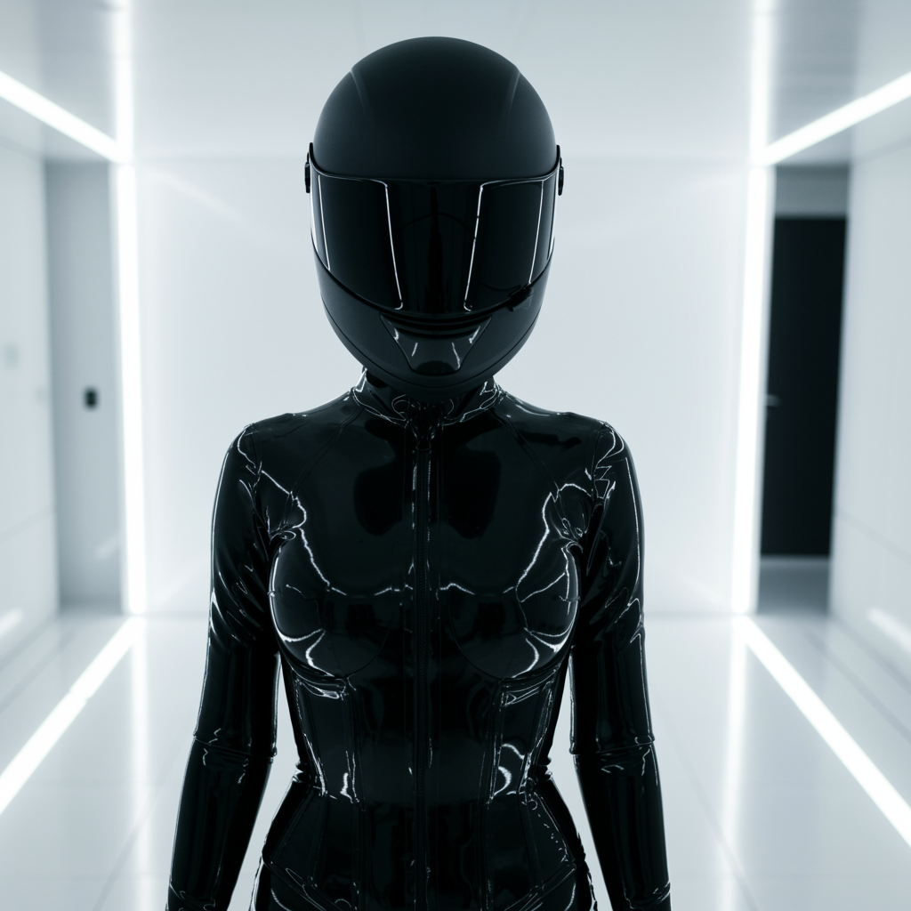 A high-definition close-up of a woman dressed in a sleek black latex suit and a matte black full face helmet, posed gracefully in a white minimalist space. The room exudes a futuristic atmosphere, enhanced by soft ambient lighting that casts subtle shadows across the glossy surface of her attire. Her stance is confident and poised, with a hint of mystery emanating from the mirrored visor of the helmet. The setting is devoid of clutter, emphasizing the clean lines and modern aesthetics, creating a captivating contrast between the shiny black latex and the stark white surroundings.