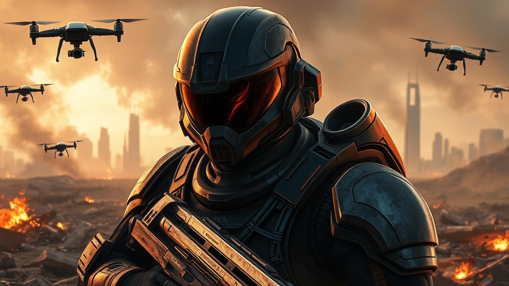 A high-definition digital painting of a sci-fi futuristic soldier clad in intricate, advanced armor and wielding cutting-edge weaponry. The soldier's sleek visor reflects the dynamic lighting of a war-torn battlefield. Hovering drones buzz overhead amid scattered burning wreckage, casting shadows across the scene. In the background, a distant futuristic city skyline stands tall, shrouded in smoke and chaos. Subtle creative modifications highlight the soldier’s resilience and determination, capturing the essence of a world teetering on the brink of destruction.