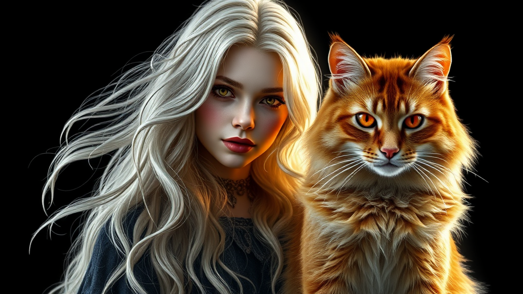 A high-definition digital rendering portrays a female white cat witch, her cascading locks of golden-white hair shimmering gently. Her honey-amber eyes, reminiscent of the afternoon sun, watch over her realm with an air of grace and authority. By her side stands her mystical counterpart, a commanding ginger cat whose fiery red eyes gleam with intensity, like embers igniting in the dark. Together, they form a striking silhouette, their monochromatic fur ensemble creating a harmonious contrast. The detailed fur sways softly under ambient and volumetric lighting, adding depth and atmosphere to the mystical scene.
