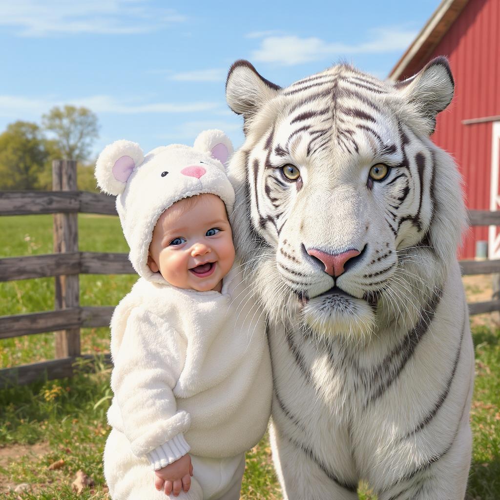 A high-definition image captures a baby and a young white tiger standing side by side, both looking directly at the camera with curious expressions. The baby is joyfully smiling, dressed in an adorable fluffy white outfit adorned with black stripes that mirror the tiger's unique fur patterns. The outfit is complete with a cozy hat featuring playful tiger ears. Both the baby and the tiger are of similar size, exuding a heartwarming sense of innocence and companionship. They are situated on a picturesque farm, with a richly detailed background showcasing rustic wooden fences, a red barn, and lush green fields under a clear blue sky. The photorealistic style highlights the fine textures of the tiger's fur and the soft fabric of the baby's outfit, bringing the scene to life with vivid reality and a hint of enchanting charm.