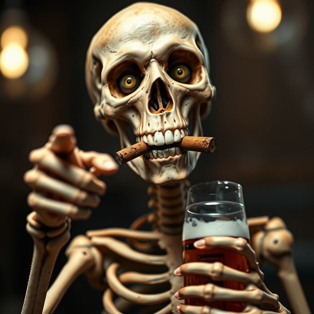 A high-definition image of a skeleton with a cigar in its mouth, looking directly at you, pointing with one hand and holding a beer in the other. The image is captured in 16k resolution with ultra-high-definition and high dynamic range. The skeleton has realistic human features such as flesh-covered hands and skin. Its eyes have deformed irises and pupils, giving them a cross-eyed appearance. The face appears slightly cloned, with extra fingers and mutated hands that are subtly noticeable. The background features a minimalistic, out-of-focus setting to highlight the subject. The composition is tightly framed to capture the expression and details, avoiding any distractions like text or watermarks. The image maintains a natural aesthetic while adding slight creative variation to standard features.