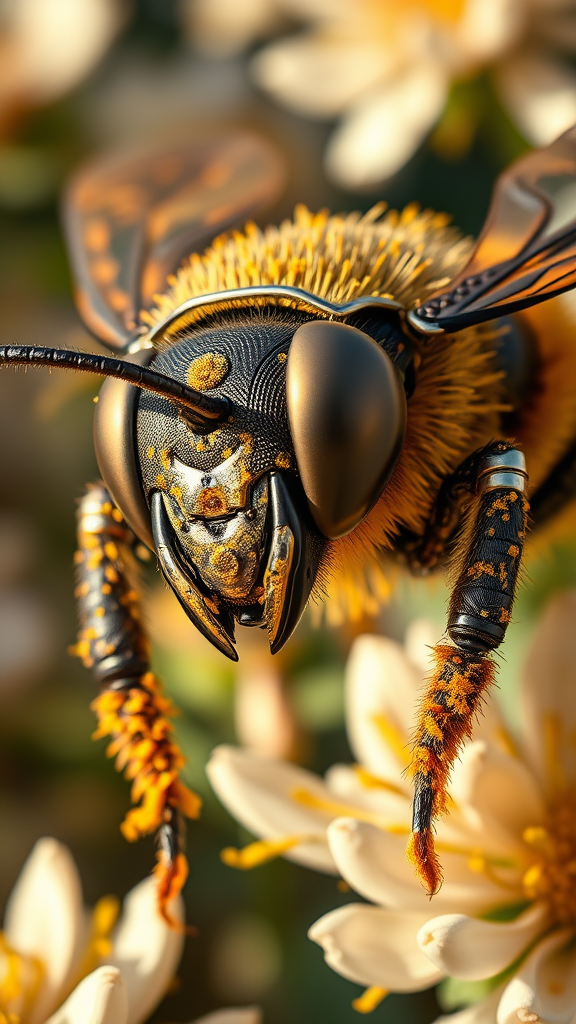 A high-definition macro portrait of a robotic bee, intricately designed with metallic textures and lifelike details, its compound eyes reflecting the surrounding environment. Tiny gears and circuits are visible beneath its translucent wings, which shimmer with iridescent hues. The bee is covered in golden pollen particles, mimicking organic fuzz, emphasizing its hybrid nature. Sunlight catches the pollen, creating a warm glow, while a soft-focus background of blooming flowers adds depth to the scene.